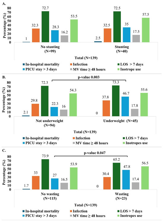 Outcomes (in-hospital mortality, infection, prolonged LOS > 7 days, PICU stay > 3 days and MV time ≥ 48 h) by malnutrition indicator (stunting (A), wasting (B), and underweight (C)). Pearson’s Chi-Square test was used (no expected counts less than 5). LOS: length of hospital stay; PICU: pediatric intensive care unit; MV: mechanical ventilation.
