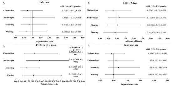 Logistic regression models adjusting for age group, gender, and RACHS-1 risk categories were used to estimate the adjusted odds ratios (aORs) and corresponding 95% confidence intervals (CIs) for the binary outcomes including the occurrence of infection, prolonged LOS, prolonged PICU stay, and inotrope use for patients with wasting, stunting, underweight or those classified as malnourished based on the ASPEN classification. Given the relatively small sample size, we limited the number of covariates in the models, and we did not incorporate other potential predictors. Logistic regression analyses were not reported for the binary outcomes of mortality and prolonged mechanical ventilation time, due to the low event frequencies, which can restrict the use of multiple predictors. Additionally, multivariable analyses stratified by age groups and disease severity were not reported to avoid biased estimates, as such stratifications could result in categorical variables with few events.