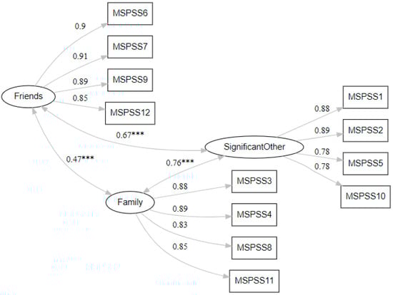 Confirmatory factor analysis for the Greek version of the “Multidimensional Scale of Perceived Social Support” (MSPSS). *** indicates p<0.001.
