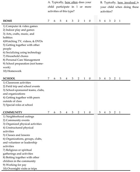 Participation and Environment Measure for Children and Youth©. Question A: 7 = daily, 6 = a few times a week, 5 = once a week, 4 = a few times a month, 3 = once in the last 4 months, 2 = a few times in the last 4 months, 1 = once in the last 4 months, 0 = never. Question B: 5 = very involved, 4 = between very involved and somewhat involved, 3 = somewhat involved, 2 = between somewhat involved and minimally involved, 1 = minimally involved.