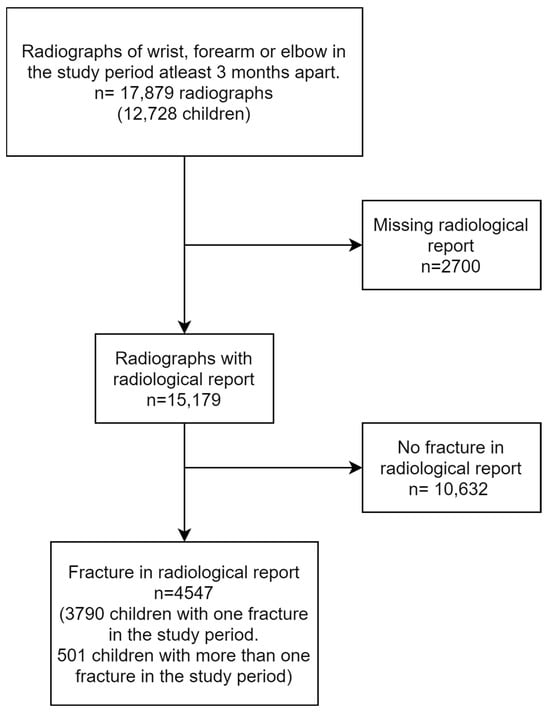 During the study period, we identified 17,879 radiographs from 12,728 children. Of these, 2700 radiographs (15%) did not have a radiological report. From the remaining 15,179 radiographs with reports, 4547 radiographs, involving 4291 children, included a description of a fracture (Figure 1).