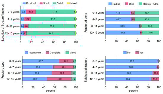 Stacked barchart of fracture location, fractured bone, fracture type and epiphyseal fracture status stratified by age group. The number of fractures within each age group were 0–3 years: n = 335, 4–7 years: n = 1143, 8–11 years: n = 1679, 12–15 years: n = 1390.
