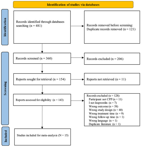 After removing duplicate records, two reviewers screened articles based on their titles and abstracts. Discrepancies that emerged were addressed through discussion and, if needed, resolved by a third reviewer. Our inclusion criteria encompassed the following: (1) single-arm studies and prospective or retrospective comparative studies; (2) children with CPP (as defined in the original studies); and (3) studies that reported long-term outcomes for children with CPP. We acknowledge the diagnostic challenges associated with CPP, given its broad spectrum encompassing isolated premature thelarche, constitutional growth acceleration, and both progressive and non-progressive forms. To mitigate potential biases, we included studies that adhered to established diagnostic criteria, such as clinical signs of puberty before age 8 in girls, advanced bone age, and elevated basal or stimulated luteinizing hormone (LH) levels. The definition of long-term is reaching adult height or final adult height after treatment, having follow-up after treatment cessation, or the onset or recurrence of menstruation. The exclusion criteria included reviews, letters, editorials, student theses, abstracts, case reports, case series, studies published before 2000, and studies without leuprorelin treatment.