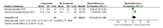 | 5 | Renata Iannetta 2015 [15] | Cohort study | Experimental group | 27 | 13.3 ± 1.3 | 0/27 | Leuprorelin | Intramuscular injection 3.75 mg/month |