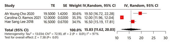 For BMD, two studies involving a total of 71 children with CPP who underwent leuprorelin treatment were identified [15,16]. However, due to variations in data format, a meta-analysis could not be conducted (Supplementary Table S2). One study found no statistical difference in BMD before and after leuprorelin treatment [15]. Conversely, another study suggested an increase in BMD before 2 years but a potential decrease in BMD of the total femur after 2 years of treatment with leuprorelin [16]. Regarding BMD in the lumbar vertebrae, there was an increase observed following leuprorelin treatment compared with the baseline during a 3-year period.