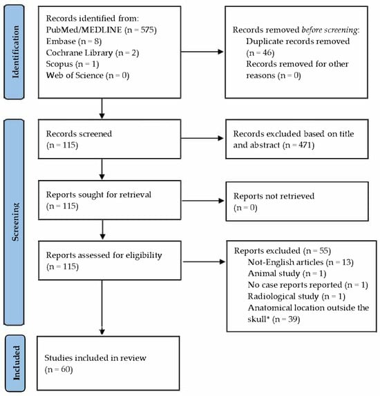 A total of 586 manuscripts were identified during the initial phase of the literature search, of which 471 were excluded based on title and abstract screening. All remaining reports were successfully retrieved. Of the 115 full-text articles assessed for eligibility, the following were excluded: 13 written in languages other than English, 1 animal study, 1 radiological study, and 1 that did not include any case report or case series. An additional 39 articles were excluded due to the anatomical location not being relevant to the neurocranium.