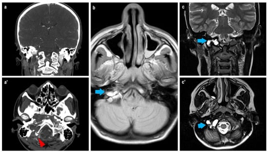Radiological findings at the CT scan (a,a’): it is possible to appreciate the bony erosion caused by the extracranial expansive lesion at the right occipital condyle (white asterisk, red arrowhead) with direct contact to the sigmoid sinus. At MRI (b,c,c’), the presence of the characteristic fluid–fluid interface of aneurysmal cyst is clearly visible (blue arrows).