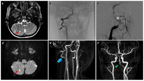 Angio-MRI T2w (a) and DWI (a’) sequences showing a hyperintense area (red arrow) of the right cerebellar hemisphere, a possible ischemic consequence of the suspected vasospasm of the posterior cerebral circulation. Angiographic study (b) confirmed a floating thrombus at the right VA previously described as a VA stenosis at the Angio-MRI (b’). A flow-diverter placement was not possible, thus requiring a coiling (white asterisk) of the VA sparing the PICA (c). The control Angio-MRI (c’) showed the exclusion of the right VA after the endovascular procedure (green arrowhead).