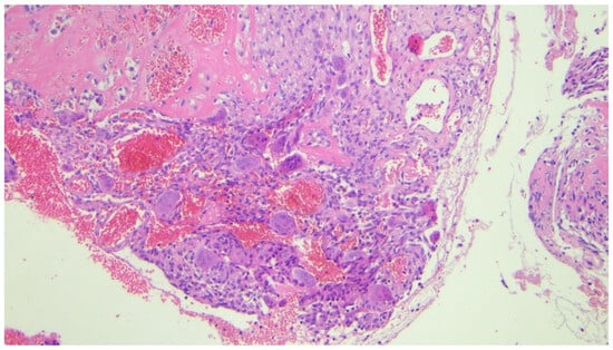 Photomicrograph (hematoxylin-eosin, ×20 magnification) showing numerous multinucleated giant cells filling the wall of the cystic lesion associated with deposition of new bone matrix (upper left).