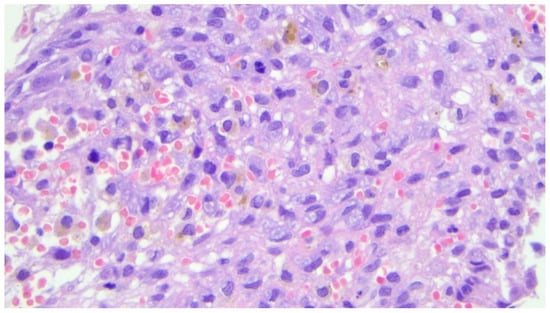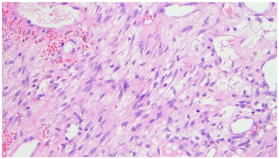 Photomicrograph (hematoxylin-eosin, ×20 magnification) showing associated loose proliferation of spindle cells without significant atypia.
