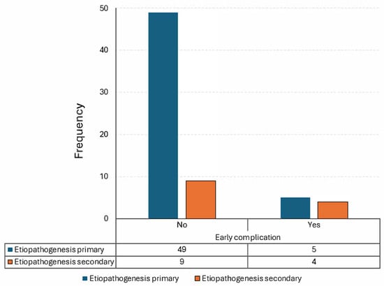 A statistically significant difference in the frequency of early complications was found between patients with primary ABCs and those with secondary lesions (regardless of whether they originated from fibrous dysplasia or other genetic syndromes) (p = 0.041, Table 5, Figure 7). This finding indicates that secondary lesions are more likely to develop early complications within the first month after surgery, regardless of their origin.
