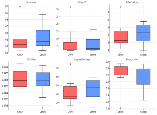 Alpha-diversity indices in stool samples from infants with CMIAP and healthy controls. The box-and-whisker plots show the interquartile range (box), median (horizontal line), and 1.5 × IQR whiskers; individual points represent outliers.