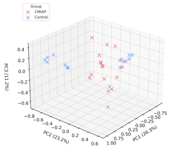 Principal coordinate analysis (PCoA) of the Bray–Curtis dissimilarity matrix for stool samples from infants with CMIAP (red; n = 16) and healthy controls (blue; n = 16). Axes represent the first three principal coordinates (PC1 = 26.3% variance; PC2 = 23.2%; PC3 = 11.2%). Points denote individual infants; grid lines correspond to 0.2 units in the Bray–Curtis space.