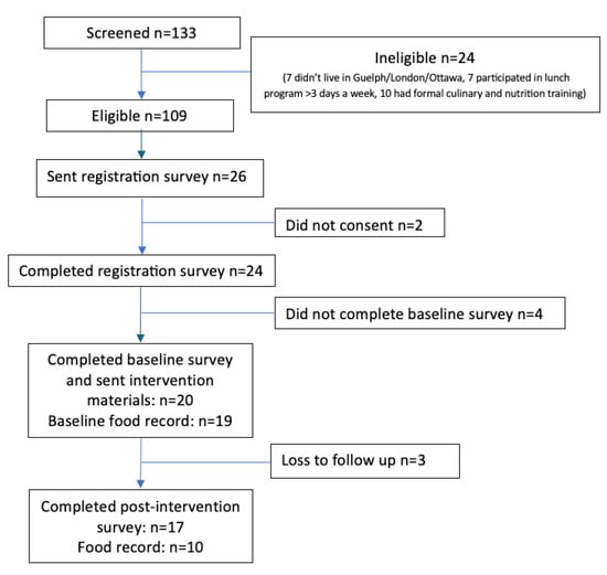 The Better Lunch Box intervention was developed in consultation with parents, Registered Dietitians, and behavior change experts. The intervention was informed by the Theory of Planned Behaviour [] and was designed to target the attitudes and perceived behavioural control related to healthy lunch packing. We targeted parents of younger children (ages 4–8 years, from Junior Kindergarten to Grade 3) since in Ontario, this corresponds to a time in which parents (most often mothers) face increasing food-related responsibilities as children transition from early education and care settings (where meals and snacks are provided) to school in which school meal programs are scarce or nonexistent. A multicomponent format focused on practical components was chosen as these have been shown to be effective in promoting healthy lunch packing [,,]. An overview of the intervention components is provided in Supplemental File S1. Briefly, the components included a printed copy of the Better Lunchbox cookbook, a watertight Bento-style lunch box, biweekly text messages for four weeks, and an online cooking class led by a Registered Dietitian. The toolkit incorporated elements from formative work performed by Petresin and Battram [] on the Healthy Lunch Box Booklet. The Better Lunch Box cookbook included: benefits of a healthy lunch, healthy lunch box food choices from each food group, tips on food safety, and how to involve children in lunch packing. Finally, the cookbook included 15 tested recipes developed with culinary experts at George Brown College’s Culinary Institute. Three team members attended two in-person taste testing sessions to ensure the recipes were nutritious, tasty, and child-friendly. After brainstorming lunch box-friendly recipe ‘concepts’ with the culinary experts, two rounds of recipe tasting were conducted to narrow down to fifteen lunch box recipes. The watertight plastic lunch box was provided to families as a tangible reinforcement to support the packing of various food groups. Biweekly text messages for four weeks were sent to parents to keep them engaged and encourage them to apply the tips and recipes from the Better Lunch Box cookbook. Finally, parents and children were invited to attend an online cooking class led by a Registered Dietitian, a graduate student in nutrition, and a school-aged child who was not participating in the intervention. The online cooking class was meant to encourage parents to apply the tips and recipes from the cookbook. Recruitment for families began in January 2024, and the intervention ran from February to June 2024 (middle to end of the school year).
