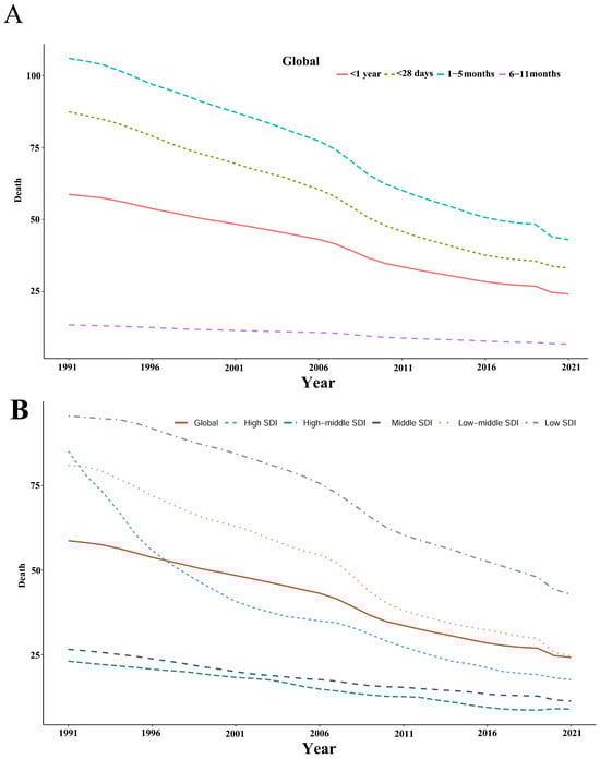 (A) Significant decrease in SIDS death rates among infants of different ages from 1991 to 2021. (B) Significant decrease in SIDS death rates across five Sociodemographic Index (SDI) categories from 1991 to 2021.
