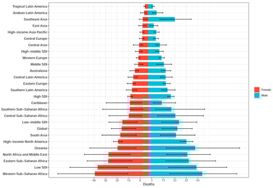 In 2021, notable disparities in SIDS mortality rates existed among the sexes (Figure 3). Globally, the male mortality rate (25.31 per 100,000; 95% UI: 12.28–38.16) exceeded that of females (22.93 per 100,000; 95% UI: 10.66–31.90). Elevated rates occurred in western (males: 46.92; 95% UI: 18.75–77.05) and eastern Sub-Saharan Africa (males: 35.19; 95% UI: 15.42–58.53), with similar trends among the female population. The high-income region of North America also showed higher rates among males (33.16; 95% UI: 27.63–38.64) versus females (26.11; 95% UI: 22.42–30.08). The lowest rates appeared in East Asia and the high-income Asia–Pacific regions for both sexes, reflecting substantial regional variation in SIDS mortality.