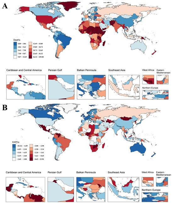 (A) National variation in SIDS death rates in 2021. (B) National EAPC variation in SIDS death rates from 1991 to 2021.