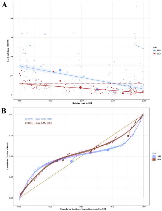 Between 1991 and 2021, marked disparities were observed in the mortality rates of SIDS across the countries stratified by the SDI (Figure 5A,B). In 1991, the SII for SIDS mortality was −60.68 (95% CI: −70.62 to −50.73), indicating a steep absolute inequality in death rates across the SDI gradient. By 2021, the SII had declined to −23.90 (95% CI: −27.46 to −20.33), reflecting an improvement in absolute equity. The CII similarly reflected a persistent but worsening concentration of SIDS mortality in the lower-SDI regions over the study period. In 1991, the index was −0.33 (95% CI: −0.49 to −0.10), denoting that SIDS deaths were disproportionately concentrated among socioeconomically disadvantaged populations. By 2021, this inequality had intensified, with a CII of −0.46 (95% CI: −0.57 to −0.34).