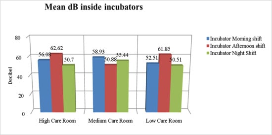 Figure 1 and Figure 2 show the mean dB of environmental noise recorded in the different NICU rooms at various times of day, both at the patient’s bedside and inside the incubators. The recorded environmental noise was always greater than 45 dB. The Student’s t-test shows no statistically significant difference in the mean of recorded environmental noise.