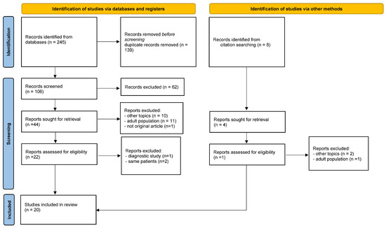 A total of 20 studies met the inclusion criteria: 10 case reports, 5 retrospective studies, 4 case series, and 1 prospective study. In total, 104 pediatric patients underwent 110 robotic procedures (Table 1). Geographically, 11 studies originated from the United States, 6 from Europe (Turkey, Italy, and France), and 3 from Asia (India and China). The study with the largest sample size was conducted by Worden et al. [14] encompassing 40 patients.
