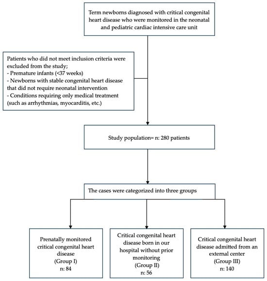 A total of 280 cases were categorized as follows: prenatally monitored critical congenital heart disease (Group I), critical congenital heart disease born in our hospital without prior monitoring (Group II), and critical congenital heart disease admitted from an external center (Group III) (Figure 1).