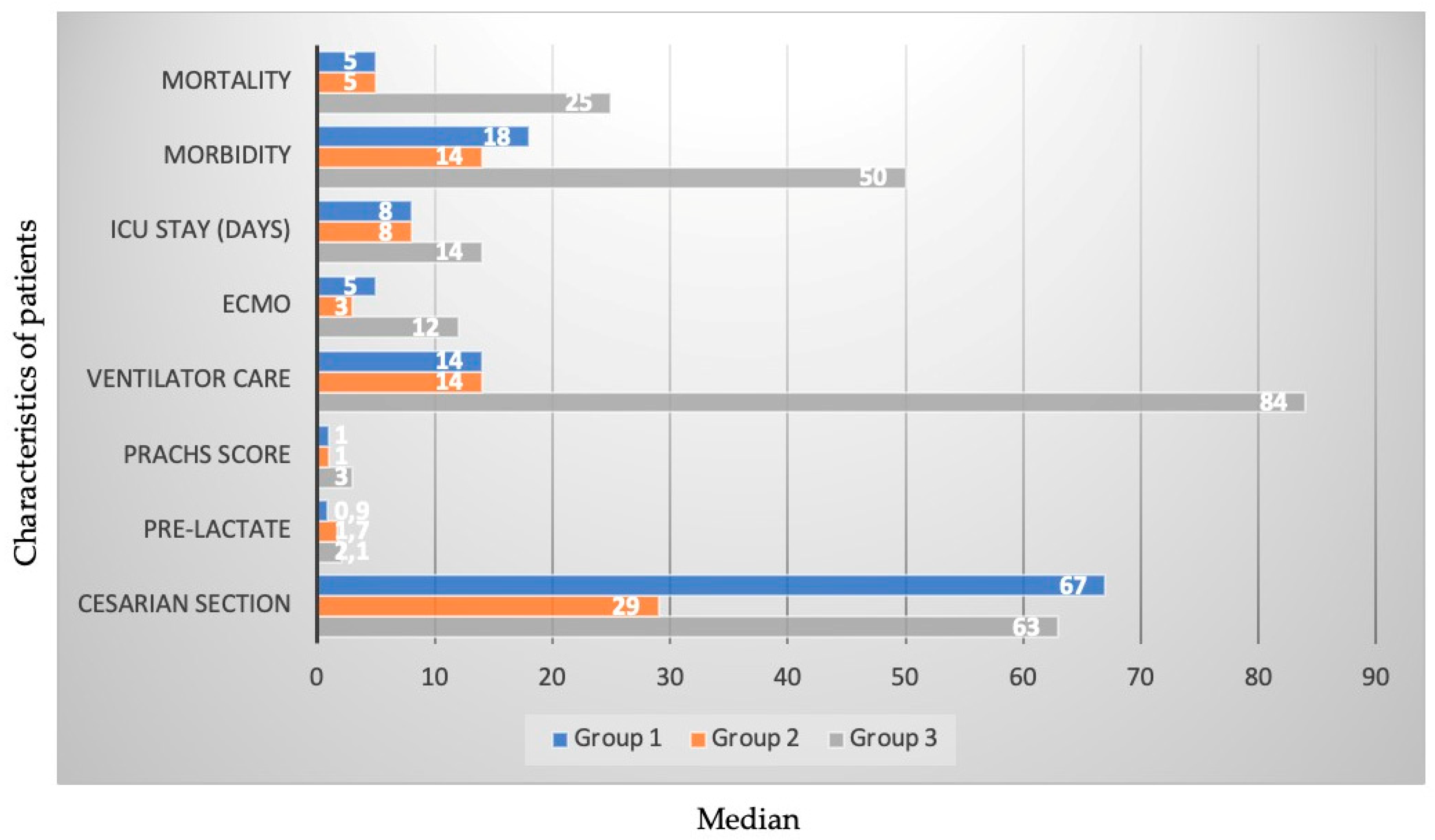 The cesarean section rate was higher in Group I compared to the other groups (80% vs. 52% vs. 45%), and preoperative lactate levels were lower (0.9 vs. 1.7 vs. 2.1). The median PRACHS score was significantly higher in Group III compared to the other groups (1 vs. 1 vs. 3). The ventilator care was higher in Group III compared to the other groups (14 vs. 14 vs. 84). Days staying in the intensive care unit were higher in Group III compared to the other groups (8 vs. 8 vs. 14). The extracorporeal membrane oxygenation (ECMO) duration was higher in Group III compared to the other groups (5 vs. 3 vs. 12). The ventricular physiology and interventional procedure time of the cases were similar. There was no significant difference between arrhythmias, acute kidney injury, low cardiac output syndrome (LCOS), and days of postop hospital stay. After interventional or surgical procedures, morbidity (22% vs. 25% vs. 36%) and mortality rates (6% vs. 9% vs. 18%) were lower in Group I and Group II compared to Group III. The characteristics with the most statistically significant difference are given in Figure 2.