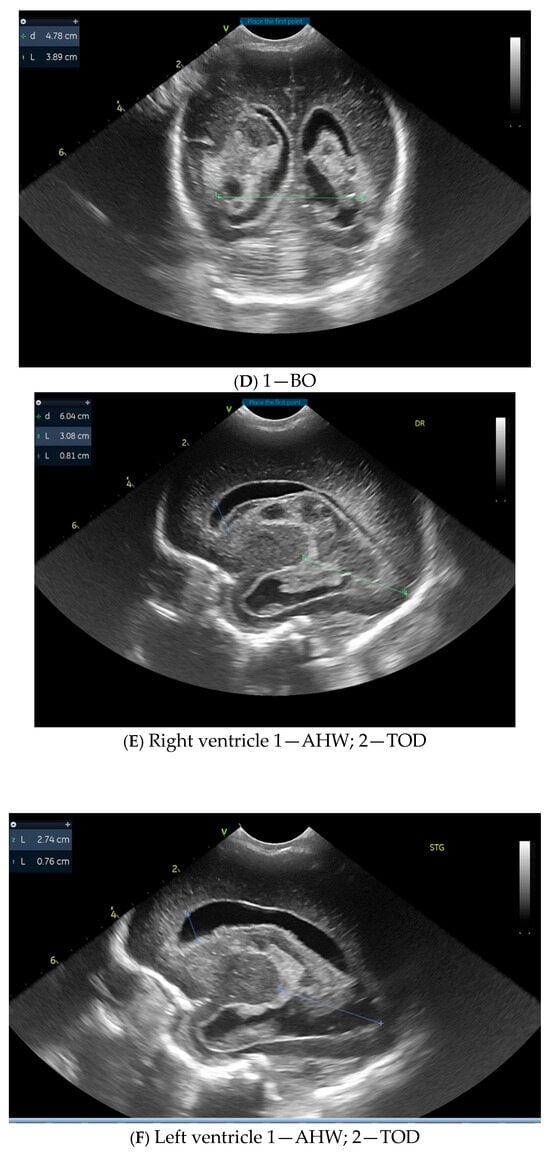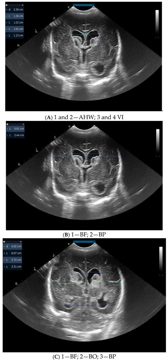 - Obeid, R.; Jacobs, M.; Chang, T.; Massaro, A.N.; Bluth, E.; Murnick, J.G.; Bulas, D.; Bandarkar, A.; Oluigbo, C.; Penn, A.A. The utility of the fronto-temporal horn ratio on cranial ultrasound in premature newborns: A ventriculomegaly marker. Pediatr. Res. 2021, 89, 1715–1723. [Google Scholar] [CrossRef] [PubMed]