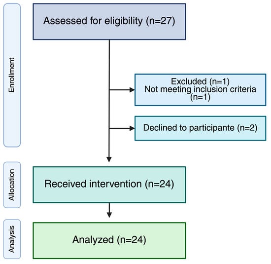Of 27 eligible children and adolescents, 24 participants were enrolled in the study (see Figure 1). Participants (12 females) were 14 ± 5 years old, had a height of 140.9 ± 19.4 cm, and weight 36.5 ± 13.8 kg (see Table 1). Fourteen children had cerebral palsy, and all the participants had moderate-to-severe cognitive impairments. According to the GMFCS, nine participants were classified at level IV and 15 at level V. No adverse events occurred during the intervention.