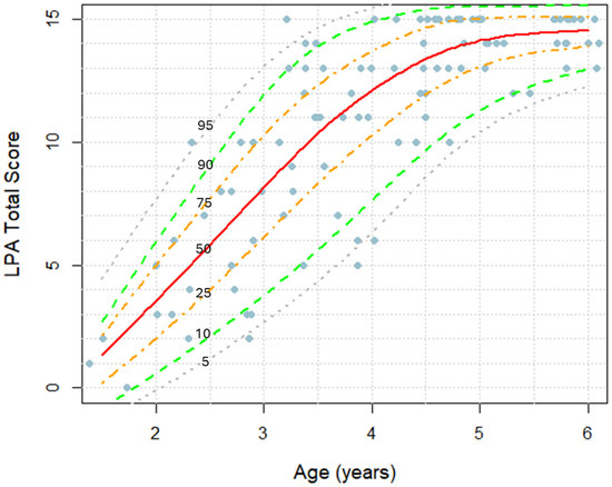 Clinician-observed LPA total score as a function of age in neurotypical children. Markers represent LPA scores in individual children. Percentile lines at 5%, 10%, 25%, 50%, 75%, 90%, and 95% are indicated.