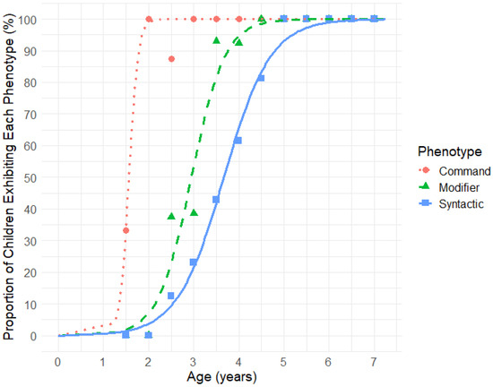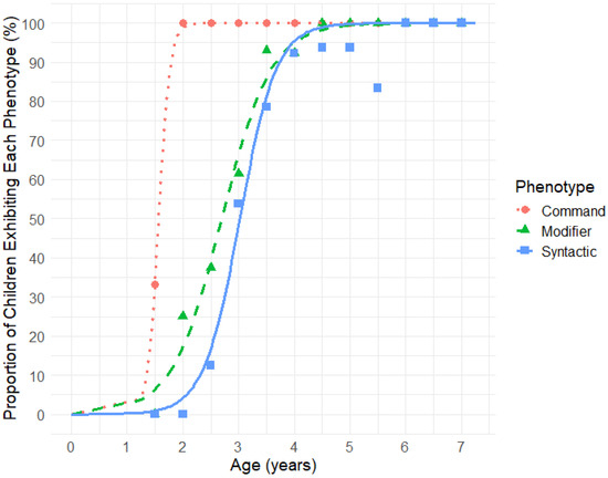 To determine the acquisition age for the Command, Modifier, and Syntactic Phenotypes, we applied the following criteria: (1) the Command Phenotype was assigned if a participant demonstrated understanding of at least two out of three Command items (items 1 to 3, Table 2); (2) the Modifier Phenotype was assigned if a participant demonstrated understanding of at least three out of five Modifier items (items 4 to 8); and (3) the Syntactic Phenotype was assigned if a participant demonstrated understanding of at least four out of seven Syntactic items (items 9 to 15). Figure 2 displays sigmoidal curves illustrating the percentage of children acquiring each phenotype as a function of age: 50% of children attained the Command Phenotype by 1.6 years, the Modifier Phenotype by 3.0 years, and the Syntactic Phenotype by 3.7 years of age. All children acquired the Command Phenotype by 3 years, the Modifier Phenotype by 4 years, and the Syntactic Phenotype by 5 years of age.
