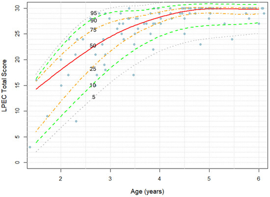 Parent-reported LPEC total score as a function of age in neurotypical children. Markers represent LPEC scores in individual children. Percentile lines at 5%, 10%, 25%, 50%, 75%, 90%, and 95% are indicated.