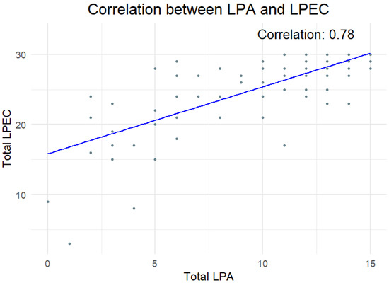 Internal consistency was excellent (Cronbach’s alpha equals 0.92), suggesting high reliability. The item-total correlations for items 4 to 15 ranged from 0.54 to 0.79, indicating that these items contribute meaningfully to the overall scale. The item-total correlations for items 1 to 3 ranged from 0.24 to 0.45, which is expected since the majority of participants had already attained an understanding of these items at the time of the assessment. The LPA test-retest reliability was evaluated by calculating a Pearson’s Correlation between the first administration of the LPA and the re-administration of the LPA to the same participants approximately 4 months (average: 111 ± 59 days, range: 29–234 days) later (20 participants). The 4 month test-retest correlation coefficient for LPA was r = 0.96 (p < 0.0001), revealing excellent LPA long-term stability. The inter-observer agreement was very high as indicated by Kappa analysis with Kappa = 0.97 and the percent overall agreement = 98.7%.