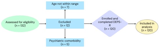 The study sample was recruited from the Pediatric Diabetes Outpatient Clinics of the 2nd Department of Pediatrics of Aristotle University of Thessaloniki at AHEPA University General Hospital, the 1st Department of Pediatrics of Aristotle University of Thessaloniki at Ιppokratio Hospital, and the 3rd Department of Pediatrics of Aristotle University of Thessaloniki at Ιppokratio Hospital. A total of 132 patients were assessed for eligibility during routine visits to the participating pediatric diabetes clinics. Twelve individuals were excluded due to not meeting the age criteria (n = 7) or having psychiatric comorbidities requiring psychotropic medication (n = 5). The remaining 120 eligible participants (61 boys and 59 girls) were enrolled in this study, completed the DEPS-R questionnaire, and were included in the final analysis. The recruitment process is summarized in Figure 1. Participants provided assent, and their parents or guardians gave informed consent prior to their inclusion in this study. The exclusion criteria included psychiatric disorders requiring psychotropic medication and ages outside the 9–18-year range.
