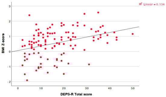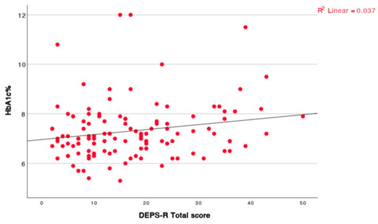 A significant positive correlation was also observed between the WHtI and the total DEPS-R score (r = 0.366, p < 0.001). To further explore potential gender-specific patterns, correlation analyses were stratified by sex. Among girls, the WHtI showed a strong positive association with the DEPS-R scores (r = 0.607, p < 0.001). In contrast, no significant correlations between the DEPS-R and the WHtI (r = 0.100, p = 0.443) was observed among boys. Of particular interest, a marginally significant positive correlation was identified between the HbA1c levels and the total questionnaire score (Figure 3). Poorer glycemic control was associated with higher questionnaire scores.