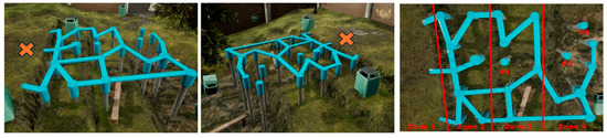 The custom-made virtual reality software collected data on the position of each individual child on the playground, relative to the different zones and pillars illustrated in Figure 1, as well as whether the child fell off the virtual playground. These data were exported as a .txt file and processed in MATLAB R2023 (MathWorks Inc., Natick, MA, USA) with in-house algorithms to obtain the following variables analyzed in the current study: the number of visits to each pillar and the time spent in each of the four zones.