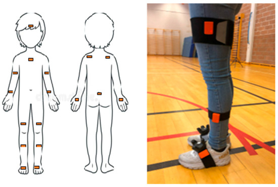 This study applied the Xsens motion capture system to designate children’s movements in the virtual playground. The inertial system captured kinematic data from joint rotations and segment movements in three orthogonal directions. Data was sampled at 60 Hz through a proprietary radio protocol at 2.4 GHz [47]. The system comprises 17 wireless sensors (IMUs) and ensures accurate time synchronization across the wireless network within 10 μs [47]. The IMUs were positioned at various anatomical locations with Velcro straps or attached to a specially designed T-shirt (see Figure 2). Each IMU has a size of 47 × 30 × 13 mm and weighs 16 g. The IMU system has been recommended for use in biomechanics, sports, and rehabilitation, as it is highly portable, enables full-body movement data, and is a reliable tool for capturing movement data compared to wired inertial systems [48,49,50].