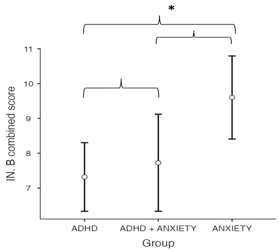 Between-group differences in IN-B combined score of the NEPSY-II Inhibition. Asterisks (*) denote statistically significant differences (p < 0.05).