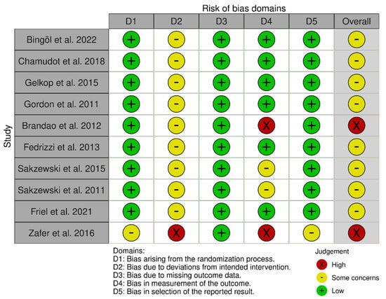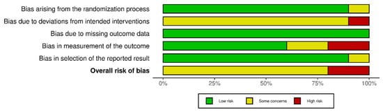 Regarding the risk of bias, most studies were classified as having some concerns, except for two [,], which were classified as high-risk. For a detailed analysis of the evidence synthesis, see Figure 1 and Figure 2.