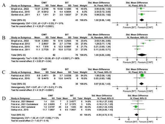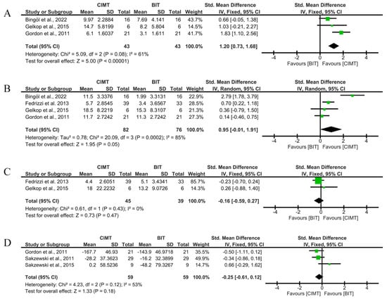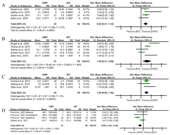 Immediate-term results for unimanual UFL measured using QUEST and JTHFT. (A) Std. mean difference (95% CI) of the effect of CIMT vs. BIT in the QUEST dissociated movement domain [,,,]; (B) std. mean difference (95% CI) of the effect of CIMT vs. BIT in the QUEST grasp domain [,,,,]; (C) std. mean difference (95% CI) of the effect of CIMT vs. BIT in total QUEST [,,]; (D) std. mean difference (95% CI) of the effect of CIMT vs. BIT on the JTHFT [,]. BIT: bimanual training; CI: confidence interval; CIMT: constraint-induced movement therapy; IV: inverse variance; SD: standard deviation. Bonferroni corrected significance level: α = 0.05/4 = 0.0125. The green squares represent the effect estimate for each study. Size is proportional to the study weight in the group. Black diamonds represent the pooled effect. The widths represent the 95% CI of the combined result.