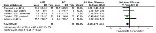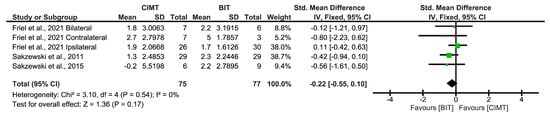 Four studies used the JTHFT to assess unimanual ULF, with Friel et al. [] achieving the best results. No significant results were found for CIMT in the JTHFT (SMD = −0.38; 95%CI = (−1;0.24)) (Figure 8).