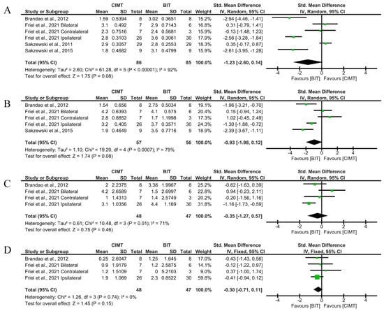 Short-term results for unimanual UFL measured by QUEST and JTHFT. (A) Std. mean difference (95% CI) of the effect of CIMT vs. BIT in the QUEST dissociated movement domain [,,]; (B) std. mean difference (95% CI) of the effect of CIMT vs. BIT in the QUEST grasp domain [,,,]; (C) std. mean difference (95% CI) of the effect of CIMT vs. BIT in the total QUEST [,]; (D) std. mean difference (95% CI) of the effect of CIMT vs. BIT on the JTHFT [,,]. BIT: bimanual training; CI: confidence interval; CIMT: constraint-induced movement therapy; IV: inverse variance; SD: standard deviation. Bonferroni corrected significance level: α = 0.05/4 = 0.0125. The green squares represent the effect estimate for each study. Size is proportional to the study weight in the group. Black diamonds represent the pooled effect. The widths represent the 95% CI of the combined result.
