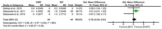 Long-term results for bimanual ULF measured by the AHA [,,]. BIT: bimanual training; CI: confidence interval; CIMT: constraint-induced movement therapy; IV: inverse variance; SD: standard deviation. The green squares represent the effect estimate for each study. Size is proportional to the study weight in the group. Black diamonds represent the pooled effect. The widths represent the 95% CI of the combined result.