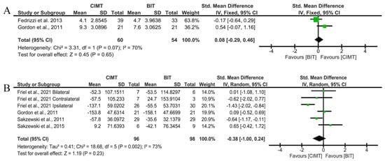 Long-term results for unimanual ULF measured by QUEST and JTHFT. (A) Std. mean difference (95% CI) of the effect of CIMT vs. BIT in the QUEST grasp domain [,]; (B) std. mean difference (95% CI) of the effect of CIMT vs. BIT on the JTHFT [,,,]. BIT: bimanual training; CI: confidence interval; CIMT: constraint-induced movement therapy; IV: inverse variance; SD: standard deviation. Bonferroni corrected significance level: α = 0.05/2 = 0.025. The green squares represent the effect estimate for each study. Size is proportional to the study weight in the group. Black diamonds represent the pooled effect. The widths represent the 95% CI of the combined result.