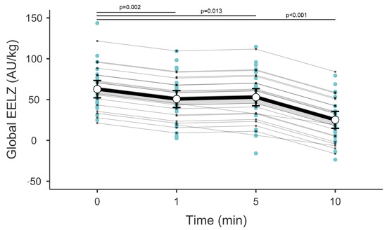 A total of 16 patients under mechanical ventilation were enrolled, and a total of 31 suctioning events were documented. Patient anthropometric and demographic characteristics are outlined in Table 1. There were no significant desaturation events in the cohort. Over a 10 min period following suction, there was a consistent change in EELZ and DeltaZ, with EELZ decreasing and DeltaZ increasing accordingly (p < 0.001, Figure 1 and Figure 2). While EELZ appeared to reach a stable point at the 5 min, this effect proved to be transient, as there was still a continuous loss of EELZ at the 10 min mark. DeltaZ exhibited a continuous increase throughout the measured periods without variations.