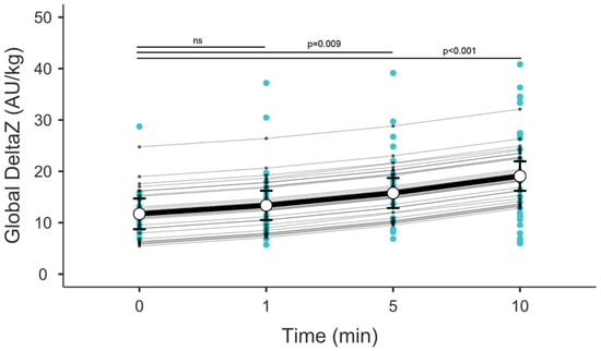 DeltaZ over time post-suctioning. Error bars represent the mean with 95% confidence intervals. Blue dots represent multiple measurements at each time point from all patients. Grey connecting lines represent random effects. AU—arbitrary units.
