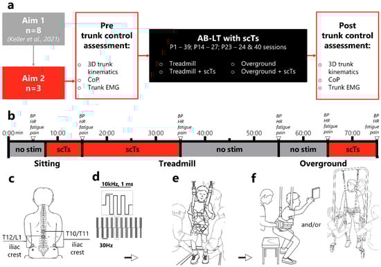 Study design and intervention session. (a). Scheme of the experiment. Three of the eight participants from the previous Aim [12] were enrolled in the current study. Participants completed a trunk control assessment pre- and post-AB-LT with scTS intervention. (b). AB-LT with scTS intervention. The timeline shows the approximate timing of different locomotor training conditions. After a period of optimization of the stimulation parameters (sitting, scTS), AB-LT on the treadmill (scTS, then with no stimulation) and on the overground (no stimulation, then scTS). BP, HR, fatigue, and pain were measured at the end of each condition (grey arrows). (c). Electrode application. Cathodes were placed on the skin between the T10/T11 and T12/L1 vertebrae, and anodes were placed over bilateral ASIS. (d). Current modulation. The 10 kHz current was packaged in 15, 30, or 60 Hz packs. (e). Treadmill condition. Activity-based Locomotor Training was performed by therapists and activity-based technicians to promote load-bearing, stepping, and standing with partial body weight support, manual facilitation of pelvic rotation, and limb stepping kinematics with upright trunk and coordinated arm swing. Trunk control was also challenged during standing activities with reaching overhead and fine motor tasks [19]. (f). Overground condition. Therapists and trainers challenged trunk control during sitting, standing, and stepping overground via activities, e.g., batting balloons, catching and throwing balls, sit-to-stand with the upright trunk. Abbreviations: EMG—Electromyography, AB-LT- activity-based locomotor training, scTS—spinal cord transcutaneous stimulation, BP—blood pressure, HR—heart rate, ASIS—anterior superior iliac spine, ms—milliseconds, Hz—hertz, CoP—center of pressure.