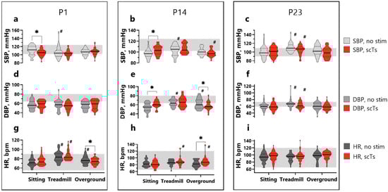 Central hemodynamic parameters averaged over all AB-LT. (a–c). SBP for each time point training for P1, P14, and P23; (d–f). DBP; (g–i). HR. Data are represented as violin plots with median (bold line) and quartiles (dashed line). Gray shades—no-stimulated condition, red color—scTS. Hatching plane—50th to 90th sex- and age-matched normal range for typical developing children. Statistical analysis: mixed linear model including a random intercept for each training point: sitting, sitting + scTS, treadmill + scTS, treadmill, overground, overground +scTS. #—vs. sitting, *—vs. scTS condition, p < 0.05. Abbreviations: SBP—systolic blood pressure, DBP—diastolic blood pressure, HR—heart rate, AB-LT—activity-based locomotor training, scTS—spinal cord transcutaneous stimulation.