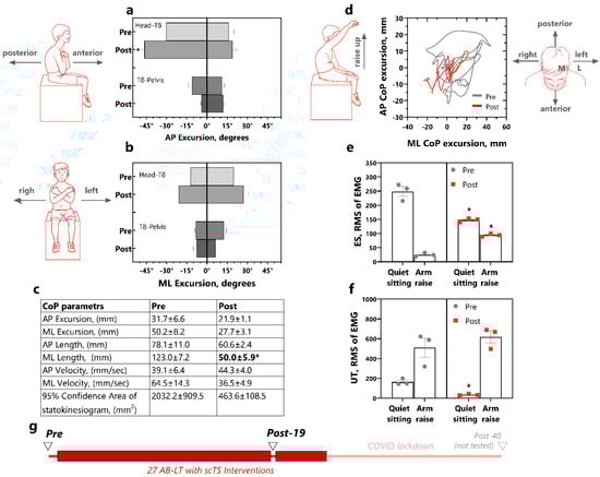 Trunk control in P14 pre- and post-19 AB-LT with scTS interventions. (a). Trunk angular excursion during anterior and posterior leaning task for head-T8 and T8-pelvis segments for three trials; (b). Trunk angular excursion during left and right leaning task for head-T8 and T8-pelvis segments; (c). Pre-post CoP parameters during “right arm up” self-perturbating task; (d). CoP trace for “right arm up” self-perturbating task over three trials; (e). RMS of EMG of rector spinae at T10 and (f). RMS of EMG of upper trapezius. (g). Study timeline showing AB-LT with scTS interventions (red rectangles) and trunk control testing (triangles). Data are represented as mean for three trials with SEM. Statistics: mixed linear models were used with timepoint (pre-, post-intervention) as a fixed factor and trial nested in timepoint as a random factor (three trials). *—vs. pre-intervention, p < 0.05. Abbreviations: AB-LT—activity-based locomotor training, AP—anteroposterior, ML—mediolateral, CoP—Center of Pressure, EMG—electromyogram, RMS—root-mean-square envelope of the EMG, T10—tenth thoracic vertebrata, ES—erector spinae, UT—upper trapezius.
