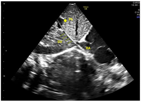 Ultrasound image. In this acoustic window, the portal sinus (PS), ductus venosus (DV), and right atrium (RA) are clearly aligned, facilitating the correct advancement of the catheter. The catheter is visible along its course, with the tip located in the right atrium.
