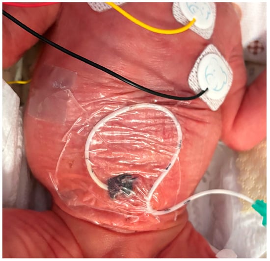 Catheter-related bloodstream infections (CRBSIs) are among the most severe complications associated with central lines, particularly in preterm neonates, where they are linked to increased morbidity, including adverse neurodevelopmental and growth outcomes [,,]. In our study, only three catheters (0.7%) were removed due to CRBSI. This incidence is considerably lower than the reported rates of 3–20% in the literature [] and may reflect the impact of the strict adherence to aseptic techniques; the use of line care bundles; and the new securement technique, which might have had an impact on the extraluminal colonization.